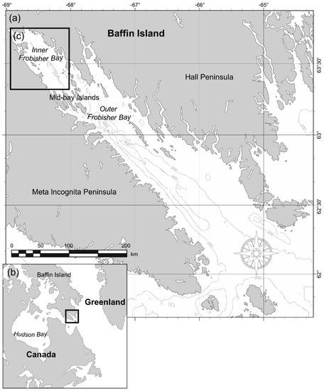 (a) Frobisher Bay, Nunavut, Canada with 200 m bathymetric contours from the GEBCO_2014 grid (The General Bathymetric Chart of the Oceans; [43]) and coastline reproduced from ESRI [44], with (b) location on southeastern Baffin Island and (c) the study area – inner Frobisher Bay.
