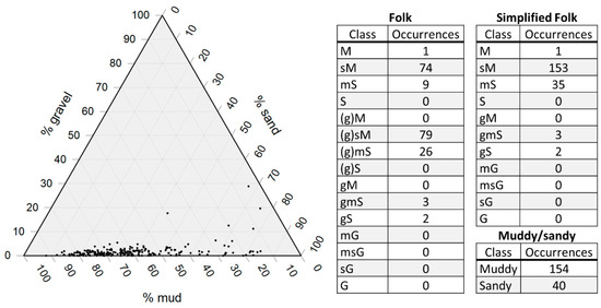 The sampled substrates were primarily muddy, with some sandy sediments (Figure 6). When classified according to Folk [20], the most common class was (g)sM (40.72%), followed by sM (38.14%) and (g)mS (13.40%). The simplified Folk scheme eliminates the “slightly gravelly” modifier, aggregating the classes (g)sM and (g)mS with sM and mS, increasing these class proportions to 78.87% and 18.04%, respectively. In the “muddy/sandy” classification, 79.38% of samples fall into the “muddy” class, with the remaining 20.62% in “sandy.” Coarse substrates were observed in 20.06% of raster cells containing underwater video observations (e.g., Figure 7; Table 1).