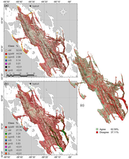 There are apparent advantages and disadvantages to both quantitative and categorical sediment modelling approaches for producing classified maps. Unclassified quantitative predictions on their own constitute a useful result for further modelling and mapping and are flexible once produced—it is easy to classify and reclassify quantitative values as necessary. The modelling process can be complex though, potentially involving data transformations such as additive log-ratios for compositional data [33], multiple models for different log-ratios [26] and multiple corresponding tuning and variable selection procedures. On the other hand, the categorical modelling procedure can be more straightforward, requiring little data manipulation once ground-truth measurements have been aggregated into classes and explanatory variables have been selected. Class labels can be predicted to new data relatively easily. Once produced though, classes are more static compared to quantitative predictions. It may be possible to simply aggregate mapped classes to a more general scheme (e.g., Folk to simplified Folk; Figure 1) but it may also be necessary to re-classify the ground-truth, select new variables and re-tune model parameters for a new classification, especially if the original scheme is a poor match for the data.