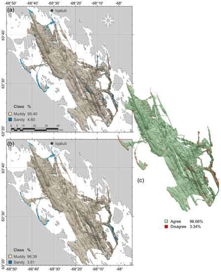 Predicted “muddy/sandy” grain size classes for (a) categorical and (b) quantitative Random Forest models, with (c) agreement between predictions.