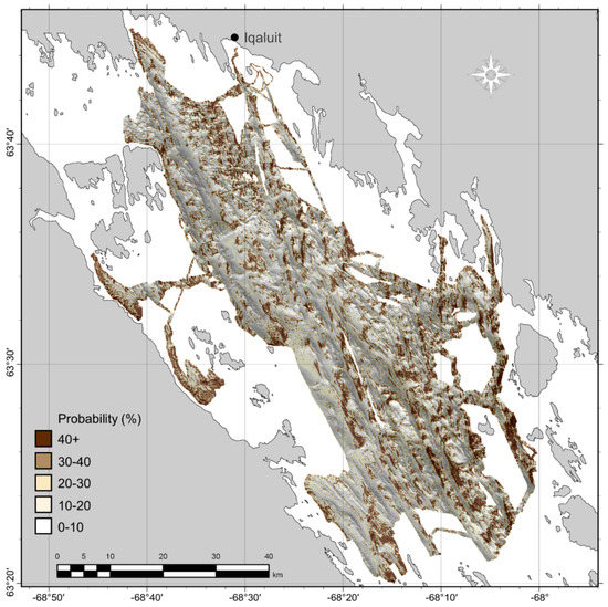 The two-class categorical muddy/sandy predictions were selected to combine with coarse substrate predictions to produce a single map of surficial sediments (Figure 12). Because the grain size scheme is binary, the categorical Random Forest predictions have the distinct advantage of a flexible threshold of occurrence, which can be readily optimized. Setting the threshold to maximize the sum of sensitivity and specificity (0.18; [55]) for predicting “sandy” sediments using S-LOO CV yielded = 0.27. Having selected this model, the performance was tested after dropping further unimportant predictors identified from estimates of variable importance. Maintaining only the top six variables (bathymetry, backscatter, 300 m profile curvature, 10 m and 450 m slopes, 10 m VRM) resulted in more accurate and more stable grain size predictions using S-LOO CV. At the 0.18 threshold, predictions were classified correctly ~70% of the time, with = 0.34 (Table 6).
