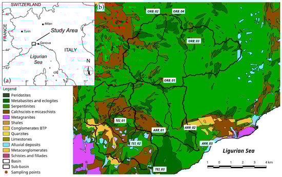 (a) Location of the study area; (b) geo-lihological map, simplified from the litholgical map of Regione Liguria [].
