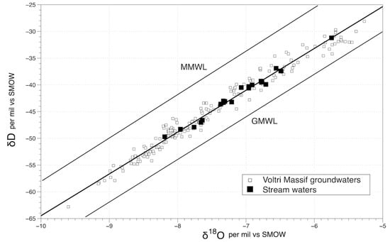 δD vs. δ18O diagram. The stream waters are compared to the global meteoric water line (δD = 8 δ18O + 10 []) and to the Mediterranean meteoric water line (δD = 8 δ18O + 22 []). In the same diagram are reported also the groundwaters of the Voltri Massif [].
