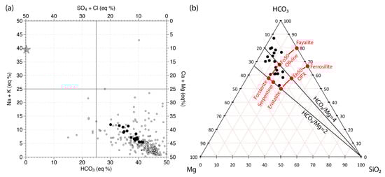 (a) Langelier–Ludwig diagram showing the sampled stream waters (black dots) and 375 groundwaters of the Voltri Massif (white dots []). For reference, mean seawater composition is plotted as a grey star. (b) Trilinear Mg-SiO2-HCO3 plot based on molal composition: the composition of stream waters (black dots) are compared to composition of theoretical solutions deriving from dissolution of some relevant mafic minerals (red dots). The red lines represent the olivine and orthopyroxene series. The HCO3/Mg = 2 line represents the solutions resulting from dissolution of pure Mg silicates while the HCO3/Mg = 4 line represents the solutions deriving from dissolution of silicates where Mg is 50% of the divalent cations.