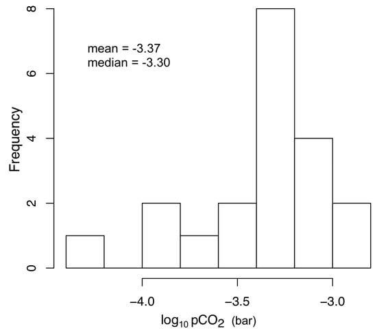 - the logarithm of carbon dioxide partial pressure (log10 pCO2) vary within a relatively small interval, from −4.27 to −2.88, following a log-normal distribution (Figure 5). Its probability distribution is characterized by a mean of −3.37 (10−3.37 bar) and a median of −3.30 (10−3.30 bar), very close to the value of equilibrium with the atmospheric carbon dioxide (10−3.39 bar assuming a CO2 concentration in atmosphere of 405 ppm), and suggests that most of the dissolved inorganic carbon derive from the atmosphere. This hypothesis is supported also by the isotopic composition of TDIC (−14.27 ≤ δ13CTDIC ≤ −6.59) that is consistent with an atmospheric origin (δ13Catm ≈ −8) of dissolved carbon with a minor contribution of soil CO2 deriving from organic matter oxidation (δ13Corg ≈ −28).