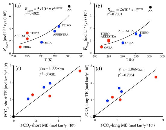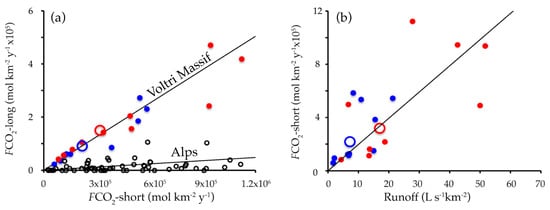 On the long term, the CO2 consumption rates of the Voltri Massif are definitely higher than the CO2 consumption rates of hydrologic basins with similar climatic conditions but different lithologies. For example, the values of FCO2-long of the Voltri Massif basins are one order of magnitude higher than FCO2-long values computed for the nearby Alpine region []. This difference is very significant because the Alpine region, characterized by similar runoff values but different outcropping lithologies, roughly approximate the world lithological distribution [,]. FCO2-long in the Voltri Massif is, on average, 42% ± 0.8% of FCO2-short, while in the Alps is only 5% (Figure 6a). In other words, the two regions consume similar amounts of carbon dioxide per unit area on the short term but, while a large part of CO2 consumed by weathering in the Alpine region is returned to the atmosphere within one million year [], more than 40% of the atmospheric CO2 consumed by the weathering of Voltri Massif ophiolites is removed from the atmosphere almost permanently (for tens to hundreds million years).