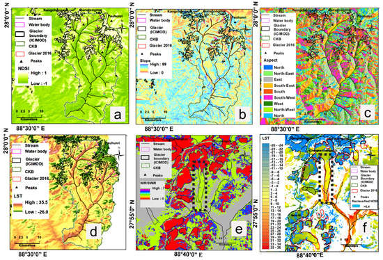 Parameters used for glacier boundary delineation: (a) NDSI map, (b) slope map (in °), (c) aspect map, (d) land surface temperature map (in °C), (e) NIR/SWIR map, (f) Composite map of LST, the glacier boundary modified from the International Centre for Integrated Mountain Development (ICIMOD) (2011) draped on (a–e) map, the (f) map contains the ICIMOD (2011) and 2016 glacier boundary. The dashed rectangular boxes in (e) and (f) map highlights the debris covered boundary of CK glacier.