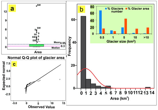Distribution of glaciers (2016) (a) box-whisker plot of glacier surface area. The words SW, SE and S represent aspect of south-west, south-east and south, respectively; (b) histogram of glacier distribution; (c) normal Q-Q plot of glaciers.