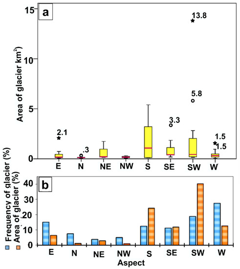 Glacier termini, situated at a lower elevations are more vulnerable to climate change, therefore, the minimum altitude of glaciers become an essential parameter to investigate []. In the CKB, glaciers’ termini on southern, south-eastern and northern aspects are situated at the lower altitude (<5100 m) as compared to the other aspects (Figure 8a). Glaciers’ termini on the southern aspect, are situated at the lowest elevation (<5000 m), probably due to the existence of large-sized glaciers on this aspect. The moderate negative relationship (significant at 0.05 level) exists between glacier size, and the minimum elevation occupied by the glacier (Supplementary Table S3). This relationship signifies that the bigger glaciers generally attain relatively lower altitudes.