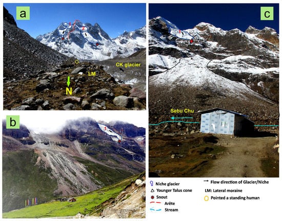 Previous studies have identified numerous climatic and non-climatic parameters such as temperature, precipitation, glacier area, slope, aspect, shape, hypsometry, elevation, etc. as the controlling factors of glacier distribution on the Third Pole region [,]. This study shows the large-sized glaciers have mostly south, south-east, and south-west aspect (Figure 4a and Figure 6a). Figure 6a,b shows not only the larger glaciers but also higher frequency and maximum glacial area that are distributed on the aspects mentioned above. Nearly 43% of glaciers are situated on the southern aspect, occupying about 73% of the total glacier area. On the contrary, most of the small-sized glaciers are situated on the eastern, northern, north-eastern, and north-western aspect. The niche glacier, in the study area, is presented as Figure 7a–c. This group of niche glacier is very small in size (0.18 km2 and 0.13 km2), and having a steep slope (average slope is 30°) and on the northern aspect. The field photograph (Figure 7c) presents a fresh talus cone that has descended from the snout of niche-1, and the toe of the talus cone has been truncated by the stream Sebu Chu.