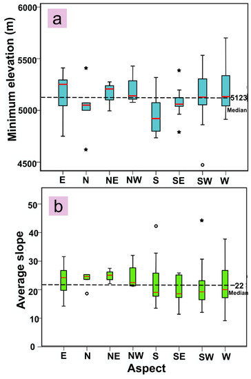 Box-whisker graphs plotted on the different aspects; (a) glaciers minimum elevations and (b) average slope of glaciers. Star mark in both graphs signify extreme values.