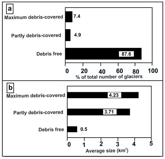 Division of glaciers according to debris cover in the ablation zone; (a) frequency distribution (in percentage) of glaciers according to type (excluding the rock glaciers), (b) proportion of area according to the glacier type.