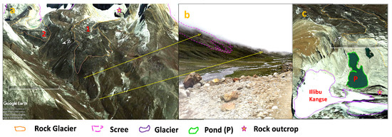 Besides, a considerable number (11) of RG exist in the CKB. The two RG, in the study area, have been represented in Figure 11a,b. Both of them extend to the western direction. The RG-1 is formed on the gentle floor and most probably evolved from a palaeo non-active debris-covered glacier (Figure 11a). Figure 10 exhibits the fresh scree extending downslope from the termini of RG-1. A thermokarst pond has formed between the front of Illibu Kangse glacier and RG-1 (Figure 11c).