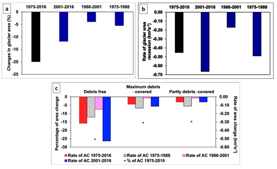 Debris have a significant influence on the glacier response to climate change [,]. This study also reports that the area loss from the debris free glaciers is nearly twice (−0.618% a−1) than debris-covered glaciers (−0.376% a−1 for the maximum debris-covered glacier, −0.361% a−1 for the partially debris-covered glaciers) (Table 5) (Figure 12). It might be due to glaciers with supraglacial debris-covered ablation areas respond differently to climate change than debris free glaciers [], (2) 5 small-sized debris free niche and cirque glaciers have disappeared during the 42 years’ from this basin.
