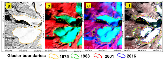 Differences between glacier outlines delineated by ICIMOD (2011) and the present study of the periods 2001 (LANDSAT ETM+) and 2016 (LANDSAT OLI-TIRS): (a) The 2001 glacier boundary and ICIMOD glacier boundary (2011) have been draped on the LANDSAT ETM+ (2001) image, (b) 2016 glacier boundary and ICIMOD (2011) have been draped on the LANDSAT OLI-TIRS image (2014).