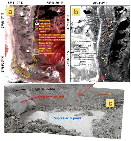 One of the essential components of the ablation budget for the debris-covered glaciers are supraglacial ponds, which act as great mediums of water storage and energy transfer []. The thinning of debris-covered glaciers are accelerated mainly with the development of supraglacial ponds []. The surface of the supraglacial ponds can absorb seven times greater heat than the average heat absorption of supraglacial debris and the combined effect of this supra-pond, and ice cliffs play a role factor in debris-covered glacier thinning []. A total of 14 identifiable supraglacial ponds on the CK glacier have developed since 2001, and were visited during 2016 field season (Figure 14b,c).