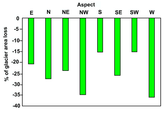 This study records that the maximum percentage of glaciers receded from the western (36%) and north-western aspects (35%), but relatively lesser in the southern (15%) and south-western (15%) aspects (Figure 15). Therefore, specific aspects reveals themselves as vital determinants of deglaciation in the CKB, probably supporting the assumption that the glaciers are of the Summer Accumulation Type.