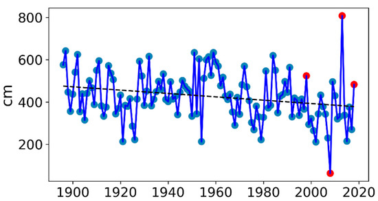 The Amur River annual maximum water levels near Khabarovsk for the period 1896–2018. Red points are dates with significant recorded events (Table 1).