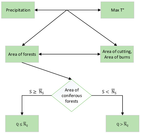 A conceptual map of the impacts on streamflow of climatic and human activities factors in the study region. S—percentage of coniferous (%), —average S of 2000–2016; Q—module of discharge, —average Q of 2000–2016.