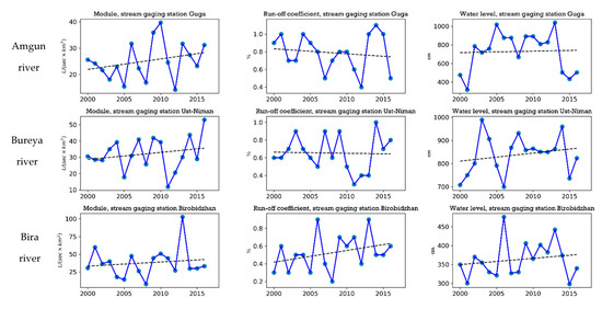 However, despite the stable state of local and regional climates, a positive trend prevails in terms of streamflow and water levels in watersheds since 2000 (Figure 6). Considering that, precipitation is the main factor in the formation of the streamflow in the rainfall floods regime, an estimation has been made of how much of the rainwater is lost due to soil infiltration in the watershed and transformation into the groundwater flow. Thus, high coefficients of flood flow for the northern rivers—the Amgun and the Bureya (average for 2000–2016, are 0.8 and 0.7 accordingly)—indicate a small loss of rainwater flowing into the riverbeds. Low negative or almost zero trend values of these coefficients (Figure 6) indicate the poor soil permeability, which contributes to the flow of precipitation, up to 70–80% into riverbeds. Consequently, the remaining part of the rainwater is lost during the transformation into the groundwater flow. Thus, the zone where the rivers of the northern areas of the Amur basin flow continues to be characterised by stable (from 1960–1980s) excessive moisture [20].