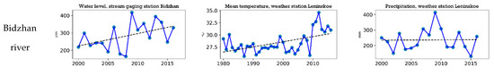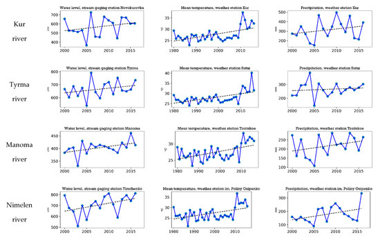 In the remaining five forest-covered river basins (Bidzhan, Kur, Nimelen, Manoma, Tyrma), a similar temporal distribution of meteorological and hydrological indicators prevails (Figure 7). Due to the lack of data on streamflow of these rivers, the highest water levels for July–August, which are the result of the maximum flow of water during the period of rain floods, were taken for analysis.