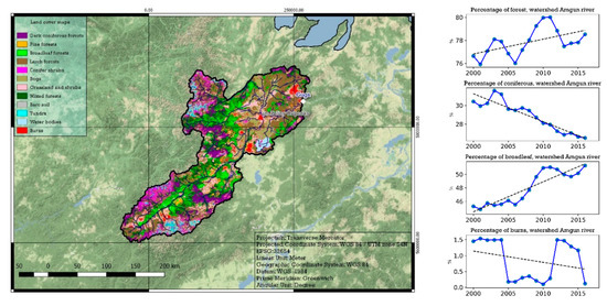 The Terra-MODIS [34] time-series dataset of 250 m resolution was used to obtain information about forest coverage and species composition in the studied watershed territory. The mapping method included pre-processing to reduce impact of interfere factors (clouds and their shadows, seasonal snow cover, hardware noise, etc.), followed by subsequent classification of various types of forests and other land cover classes using the Locally Adaptive Global Mapping Algorithm (LAGMA) [22]. The algorithm ensures classifier adaptivity to spatial changes of physical and geographical conditions, satisfying one of the requirements for methods of processing remote sensing data for large areas. The map legend includes 23 classes, 18 of them designate different vegetation types detected according to their natural forms, types of vegetative limbs and phenological dynamics. At present, this map is the most detailed spatial and thematic information resource about types of vegetation coverage of Russia, obtained using remote sensing data. The mapping process is automated, which ensures results repeatability and allows annual vegetation coverage mapping spanning whole country territory.