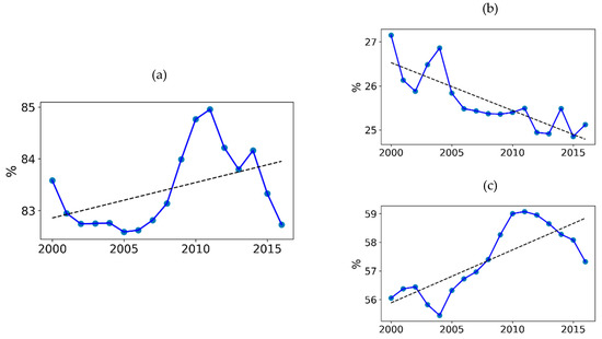 With the use of remote sensing methods, the variability of the total forest-covered watershed area for 2000–2016 has been established, as well as the dynamics of the forest area of various species of trees (Table 3). So, against the backdrop tendency of the increasing total forest coverage, the trend of the area share of primary coniferous forests, which are formed in the forest vegetation conditions typical for the watershed, retains the opposite direction (Figure 8, Figure 9 and Figure 10). The watersheds of the northern rivers and their tributaries have particularly sharp difference between the dynamics of the share of coniferous and deciduous areas, and characteristics of their trends are almost mirror opposite. The dynamics of the areas of fresh burns also has a predominantly opposite direction to the dynamics of the total forest area. However, this applies mainly to dark-coniferous, light-coniferous and larch forests, which have a resinous base and attract more frequent and intensive fires, and more prone to logging as a valuable type of wood.