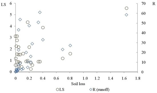 Distribution of the soil loss values (t ha−1 year−1), depending on the values of the relief function (LS) and runoff (R, mm). Source data from Ref. [38].