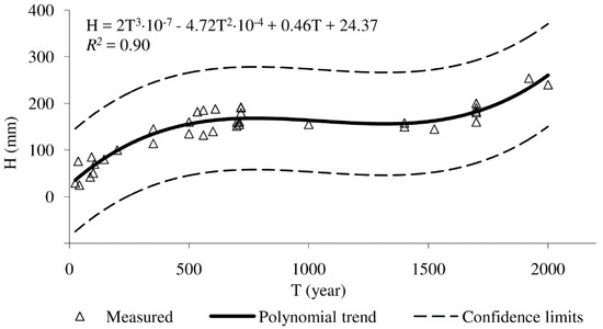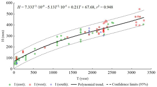 Chronofunctions of changes of the humus horizon (H, mm) of the calcaric Cambisols over time (T, years). Confidence limits (P = 0.95).