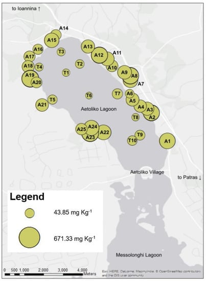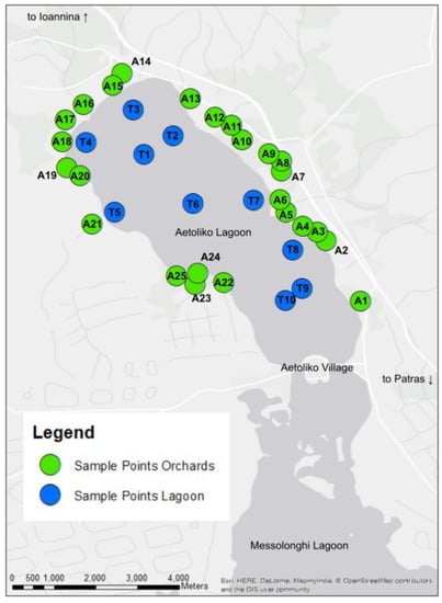 A total number of 35 samples were collected, 25 top soil samples (coding A1-A25) were taken from olive orchards around the Aetoliko lagoon and 10 samples (coding T1-T10) from the lagoon’s bottom sediments (Figure 2). The soil samples were taken using an auger to a depth of 20 cm from different orchards and to be at least 200 m apart from each other to have a clear distinction. From each sampling location four different subsamples, at about 1.5 m from the tree trunk were taken, and well mixed and homogenized according to LUCAS topsoil survey methodology []. When choosing the sampling sites on land, close attention was paid to stay within the small strip of land between the lagoon and a system of drainage canals that surround the water body in order to assure that the sample area is relatively hydrologically homogenous. The surface layer (approximately 5 cm) of the bottom lagoon sediment samples were taken using a van Veen grab operated from a small boat, and geographically covering the entire lagoon (Figure 2).