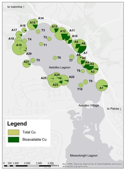 The bioavailable copper content in the lagoon is generally very low. Sample points T1 and T6 show the lowest content of bioavailable copper. The bottom sediment samples taken at T2 and T3 also show a relatively low concentration of bioavailable copper. Figure 4 shows a map of the distribution of the bioavailable copper concentration at the area of the Aetoliko lagoon as a fraction of the total copper content. The biggest shares of bioavailable copper of the total copper content were found in the orchard soil samples taken at the Eastern shore of the lagoon. The fractions of the bioavailable copper of the total copper are in the range of 3.48% (A25) and 46.06% (A3) for the orchard samples.