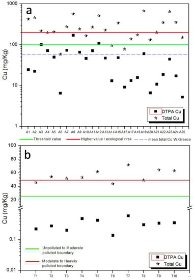 The mean values of 286.24 mg kg−1 total copper content and 45.00 mg kg−1 DTPA-extractable copper content in our study are higher than the 105 mg kg−1 and 30.2 mg kg−1, respectively, reported for Western Greece soil samples []. These numbers suggest that the influence of copper-based fungicide use in soils is higher in the Aetoliko region than in the rest of Western Greece. The majority of the samples show total Cu concentration in soils is above the threshold, the lower and the higher ecological risk value [,]. In contrast, the concentration for extractable copper for soils is well below these values (Figure 5a).
