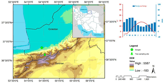 As characterized by Pourtahmasi et al. [42,43], Juniperus polycarpus is a long-living drought and cold-tolerant tree species resistant to the harsh mountain climate conditions in the southern slopes of the Alborz Mountains in North Iran. Because of its high tree ages of more than 500 years, it is widely used for dendroclimatology studies in Northern Iran [43,44,45]. We sampled tree-ring material from high-elevation and open forests of J. polycarpus (36°39′54, 4″ N; 54°31′53, 7″ E) near the village Chahar Bagh situated on the south-facing slope of the Alborz Mountains at an elevation of 2540 m a.s.l [46,47] (Figure 1). Regional climate is characterized by cold and long winters and dry summers, with mean annual temperatures and total precipitation of 7 °C and 394 mm, respectively [48]. Precipitation mainly occurs in late autumn, winter, and early spring. The summer is arid, hot and sunny, with intensive radiation most of the time.