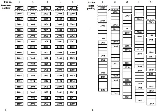 Schematic of cutting and pooling the trees rings in two ways of (a) inter-tree pooling (b) serial pooling of 5-year blocks shifted for one year between individual trees.