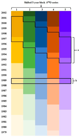 Schematic illustration of averaging the δ18O series of shifted 5-year blocks (SBP): (a) shows averaging annual δ18O values for the year 1997 in the chronology built by a 5-year running mean calculation of the δ18O values (SBPr) and (b) mean annual δ18O values for the year 1989 in the chronology built by arithmetic averaging of individual tree-ring δ18O values of the δ18O series (SBPa). Each color displays one pentad block.