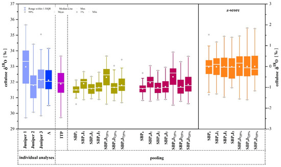 To avoid loss of variance and of extreme event signals using the shifted 5-year blocks-serial pooling, we added a single isotope series obtained from the individual analyses to the shifted 5-year block series [19]. The addition of one annually resolved series increased the δ18O mean values in all the mixed chronologies of SBPr, SBPa, and SBPz, even exceeding the mean δ18O value of chronology A (mean SBPrJ1 = 32.3; mean SBPaJ1 = 32.33) (Figure 4).