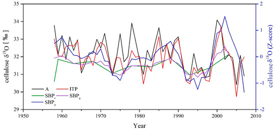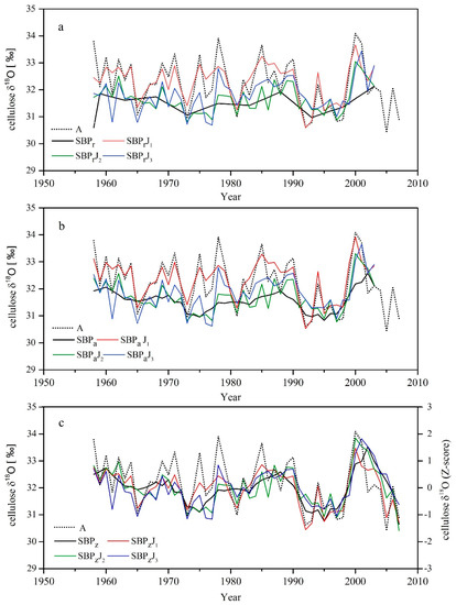 Comparison between the inter-annual δ18O variations of the mean annually resolved chronology A and the mixed δ18O chronologies of (a) SBPr includes SBPrJ1, SBPrJ2, and SBPrJ3, (b) SBPa includes SBPaJ1, SBPaJ2, and SBPaJ3; (c) SBPz includes SBPzJ1, SBPzJ2, and SBPzJ3 over the period 1958 to 2007. In chart ©, the scale of the primary (left) vertical axis reflects the values of the A chronology.