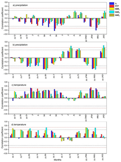 Correlations between A, ITP, SBPr, SBPa, and SBPz δ18O chronologies and precipitation (a,b) and temperature (c,d) for a 12-month period from October of the previous growing season (py O) until September of the growth year (S), seasonally averaged data (previous autumn: py OND, winter: JFM; spring: AMJ; summer JAS) (a,c), a 9-month period from January (py J) until September of the previous growing season (py S), and seasonally averaged data (winter: py JFM; spring: py AMJ; summer: py JAS) (b,d). Correlations were calculated for the period 1958–2007. Black and red horizontal lines indicate significant correlations at the p-value < 0.05 and p-value < 0.01 levels, respectively.
