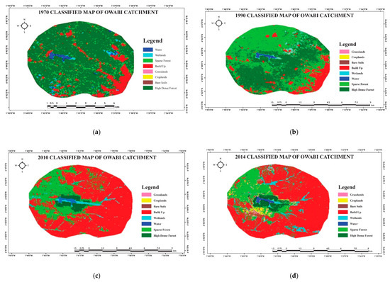 Classified maps of the Owabi catchment for 1970 (a), 1990 (b), 2010 (c) and 2014 (d).