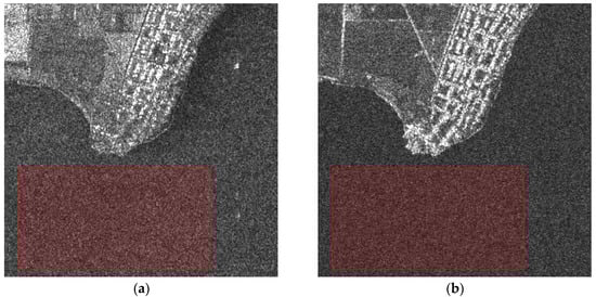 512 × 512 pixel fragments of real-life Sentinel-1 SAR images with VV (a) and VH polarizations (b) with marked manually selected quasi-homogeneous regions.