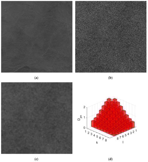 Examples of noise-free and noisy images are presented in Figure 3a,b. As one can see, noise is intensive and it masks many details and non-intensive texture that can be seen in the true image. The normalized DCT spectrum of the simulated speckle is presented in Figure 3d. Its comparison to the spectrum for real-life images (Figure 2) shows that the main properties of noise spatial correlation are practically the same.