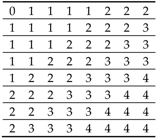 Earlier we discussed input parameters that are determined in four DCT spectrum areas [38]. A transformed image block in DCT domain is divided into four areas (stripes marked by digits from 1 to 4 in Figure 4). The mark “0” corresponds to the DCT coefficient with the block mean not “involved” in any area. After this, the following four energy allocation parameters are calculated as