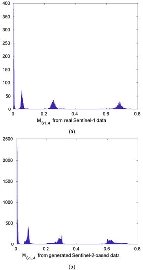 Histograms of and for real-life Sentinel-1 images (a) and simulated data using Sentinel-2 images (b).