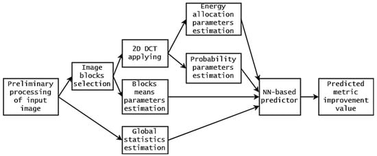 Aggregating the obtained results, we can state that combination # 33 produces excellent prediction for all three considered metrics (see data in Table 1, Table 2 and Table 3) that correspond to different groups (conventional metric, visual quality metric of DCT-based family, visual quality metric of SSIM-based family). The block diagram presenting the operations undertaken is shown in Figure 6. Table 1, Table 2 and Table 3 give the results of average RMSE and Adjusted for 100 realizations of NN learning. Sometime, training results can sufficiently differ for different realizations. To show that training is stable, Table 4 presents mean and standard deviation (STD) data for RMSE and Adjusted for 1000 realizations of NN training. As one can see, the STD of RMSE is always one order less than RMSE. STD values of Adjusted are small, and this shows that training produces stable results.