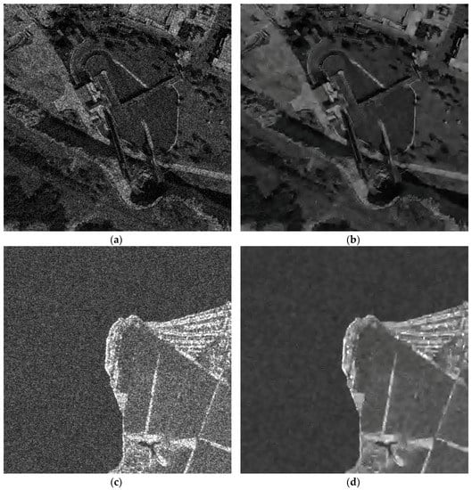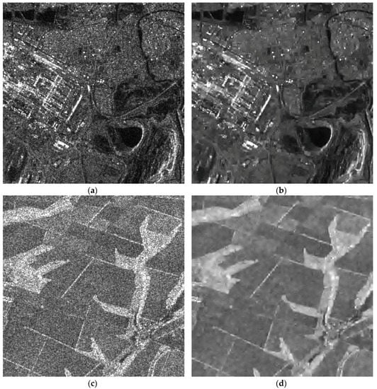 Noisy (a,c) and filtered (b,d) real images corresponding to obtained min (a,b) 5.35 dB and max (c,d) 13.89 dB predicted improvement of PSNR for real Sentinel-1 data.