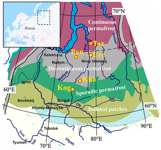 Map of the study site with permafrost boundaries [29], http://portal.inter-map.com, NSIDC, with five main test sites: Taz—Tazovsky; Ure—Urengoy; Pan—Pangody; Kha—Khanymey; and Kog—Kogalym.