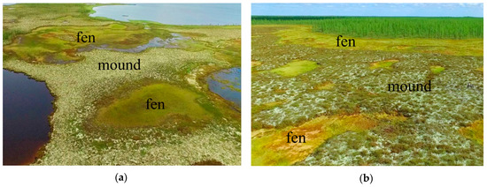 The polygonal bogs, palsa (frozen raised-mound bog), and ombrotrophic ridge-hollow raised bogs are the most extensive mire types of the study area. These bogs commonly show highly diverse patterns consisting of mounds (hummocks), polygons, ridges, hollows, and fens that correspond to the microtopes [30,31,32,33] (Figure 2). In our study, the mounds, polygons, and ridges were considered to occupy the eluvial landscape position and develop with a typically lower hydraulic conductivity. They have flat to convex transverse profiles. The hollows correspond to transient positions and the fens are located at the accumulative positions. They have a large catchment area, develop on wetter sites, have a concave form, and differ in the degree of flow and closure. The ridge in the ridge—hollow complex, the mound in the mound–hollow complex, and the polygon in the polygonal complex are considered autonomous primary geochemical l6gtandscapes. The hollow in the ridge-hollow complex and the fen are geochemically subordinate landscapes. The arrangement and combination of these microtopes and microforms create a variety of mire types or mire units (mesotope level) [30,31,32,33]. On mounds and polygons, the upper 50 cm of peat deposits consist mainly of residues of dwarf shrubs, hypnum mosses, grasses, lichens, sphagnum mosses (Sphagnum fuscum, S. majus) and, less commonly, wood. In the fens or hollows, the upper 50 cm of peat deposits consist mainly of sphagnum mosses, cotton grass, sedges, and less commonly, grasses. Deeper than 50 cm in the fens, peat usually lies, which is similar in composition to peat of the mounds. On average, the decomposition degree of the upper part of the peat deposit on the mounds is 1.6 times higher than in the fens. To the south, the share of sphagnum mosses, wood residues and lichens in the peat botanical composition of the mounds increases.