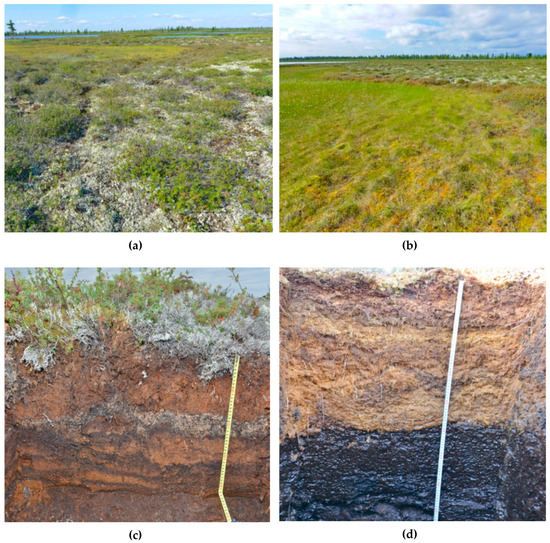 Plant communities and soils of the frozen bogs of the Khanymey site: (a) Moss–shrub–lichen community on the mound; (b) moss–sedge community of lakeside fen; (c) Dystric Hemic Epicryic Histosols; (d) Dystric Epifibric Endohemic Histosols. The soil of (c) correspond to the plant community of (a), and the soil of (d) correspond to (b).