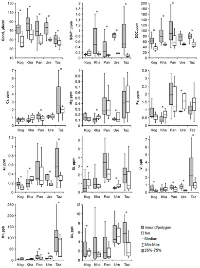 Results of the application of the Wilcoxon–Mann–Whitney test for assessing the differences in mean values with SD of DOC, DIC, major and trace elements in bog waters of two dominant microtopes are listed in Table A1 (see Appendix A). The mean values given in the last three columns for the two dominant microtopes of all key sites showed that the of the majority of the element concentrations (except Fe) in the bog waters are either approximately equal or higher by 1.5–2 times on the mounds. At the same time, according to the chosen statistical criteria, only a few parameters (specific conductivity (Cond), pH, SO42–, DOC, Fe, Ti, V, Cs, Tb and Tl) depict significant differences (p < 0.01) in their concentration between mounds/polygons and hollows/fens.