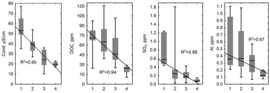 Some chemical parameters exhibited a clear trend in decreasing values (0.63 < R2 < 0.97, p < 0.05) in bog waters of the KS Tazovsky (Taz) microtopes with different hydrological regime: 1—polygons occupying elevated dry positions; 2—degraded and flooded polygons and small cracks between polygons; 3—large cracks and fens without a watercourse; 4—lower parts of the fens with a watercourse. The solid line is a linear fit to all data with the regression equation given on each graph. It should be noted that the categories (1–4) are becoming increasingly wet from left to right.